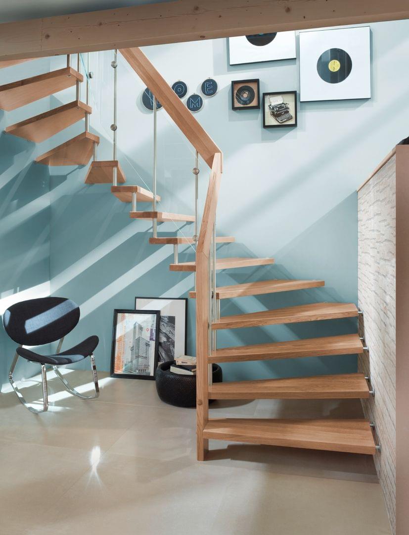 Die klassische Treppenmeister Systemtreppe ist eine moderne Holztreppe mit Holzstufen. Passend dazu ein Geländer mit Edelstahlstäben, einem Handlauf aus Holz und mit Glasfüllung statt Ganzglasgeländer gibt eine neue Optik.