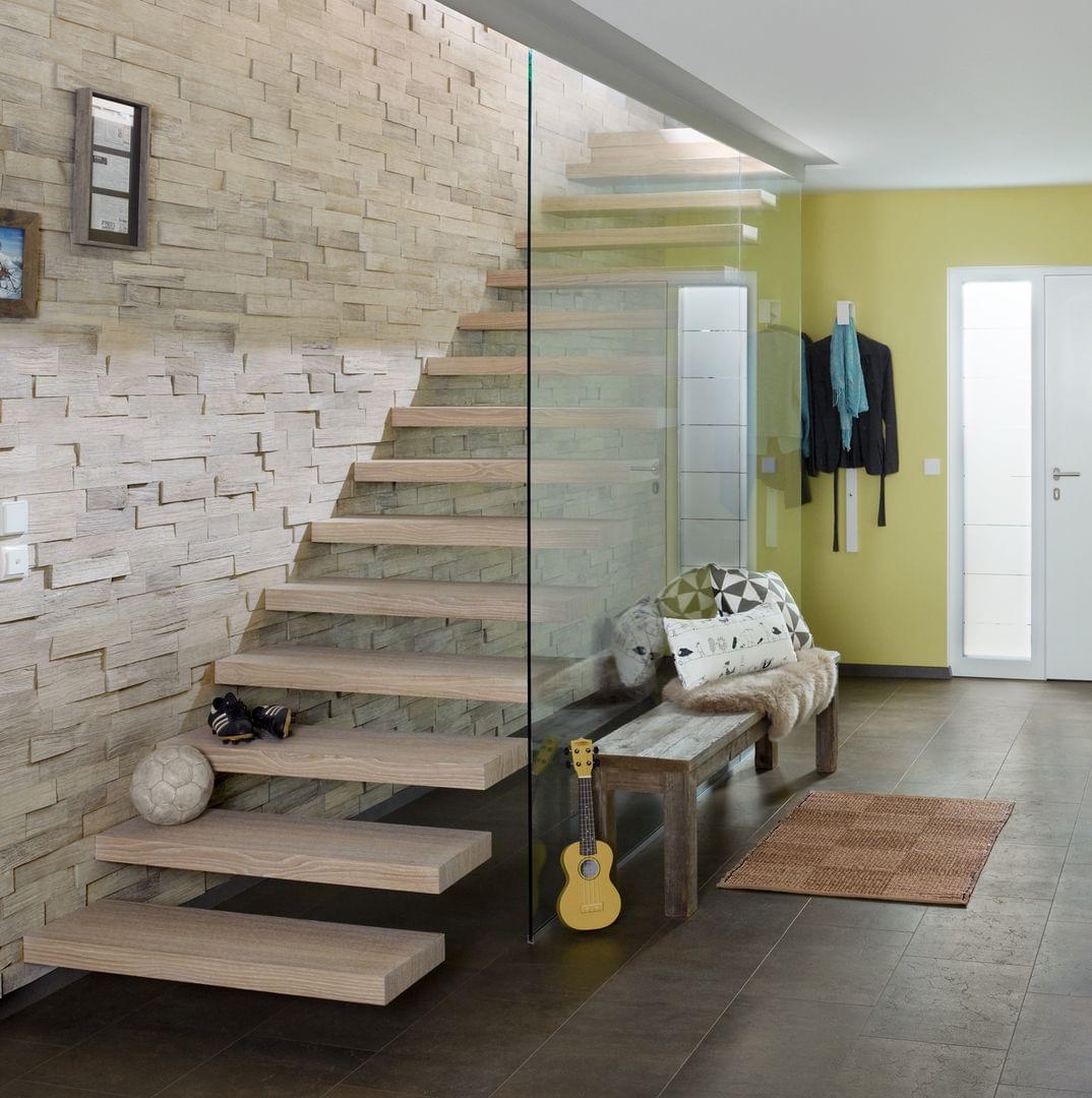 Holztreppe mit Glasgeländer