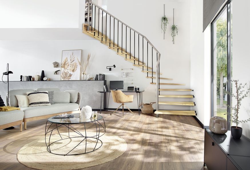 Die Systemtreppe STAR  erweitert die Gestaltungsvariante. Es lassen sich architektonische Verbindungen vom Handlauf zum Wohnraum – beispielsweise zu den Türgriffen – schaffen.