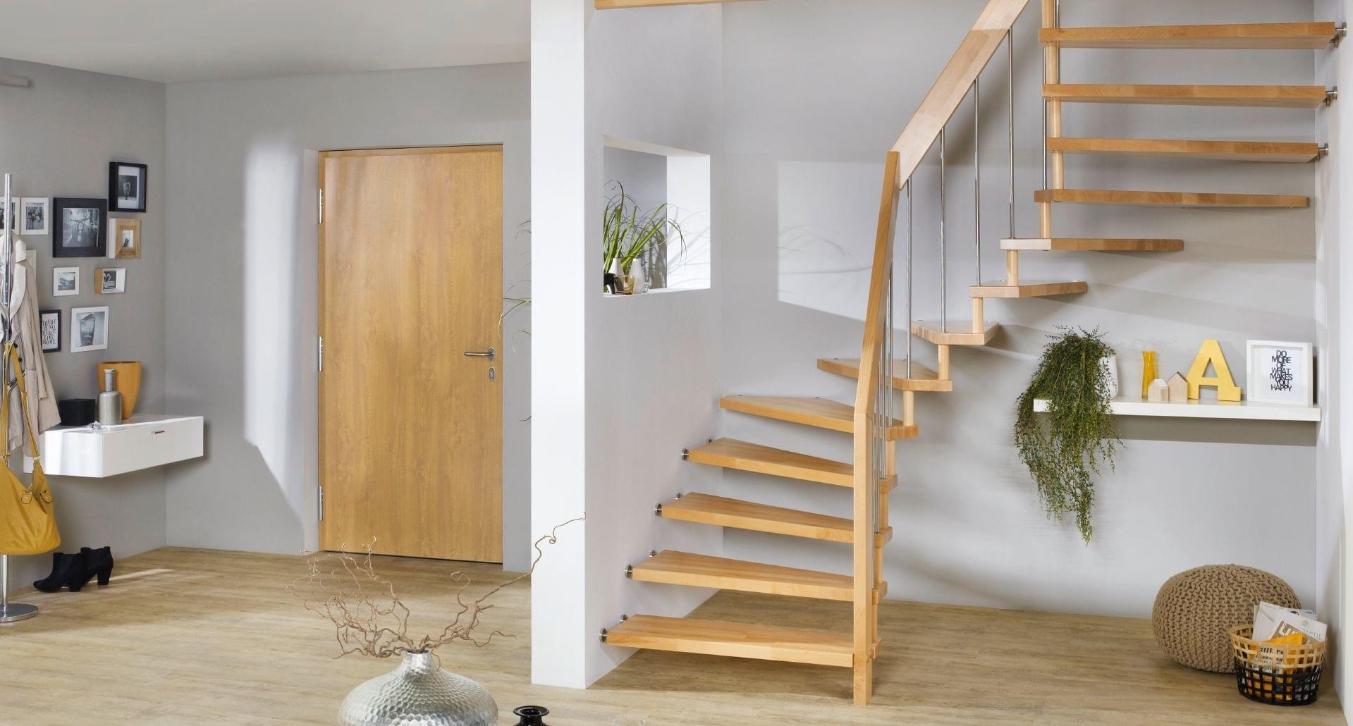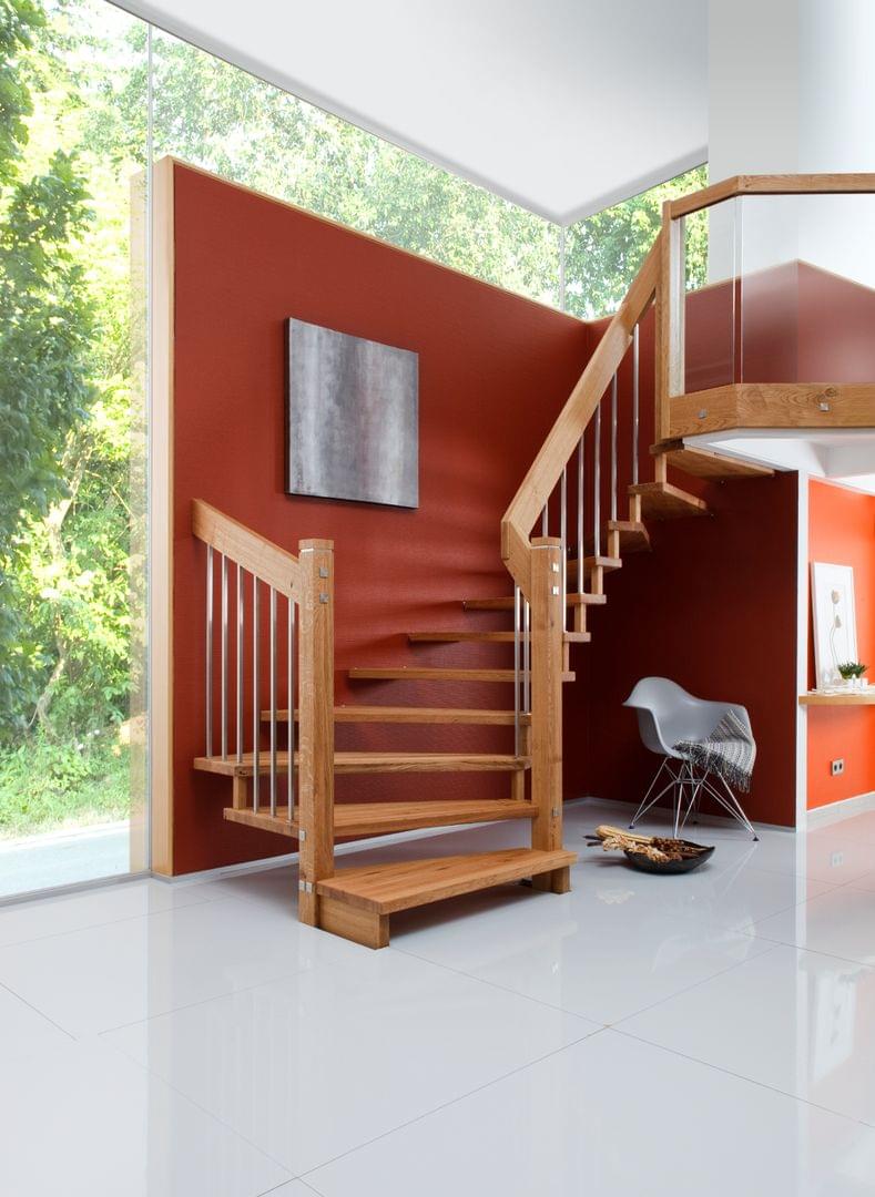 Das Modell Prisma ist eine Holztreppe System Treppenmeister mit Trittstufen und tragendem Handlauf aus Massivholz. Die Stufenvorderkanten und der Handlauf sind bei dieser Innentreppe optisch abgeschrägt. Das Stufen- und Geländerholz ist lackiert oder geölt und erhältlich in verschiedenen Holzarten.