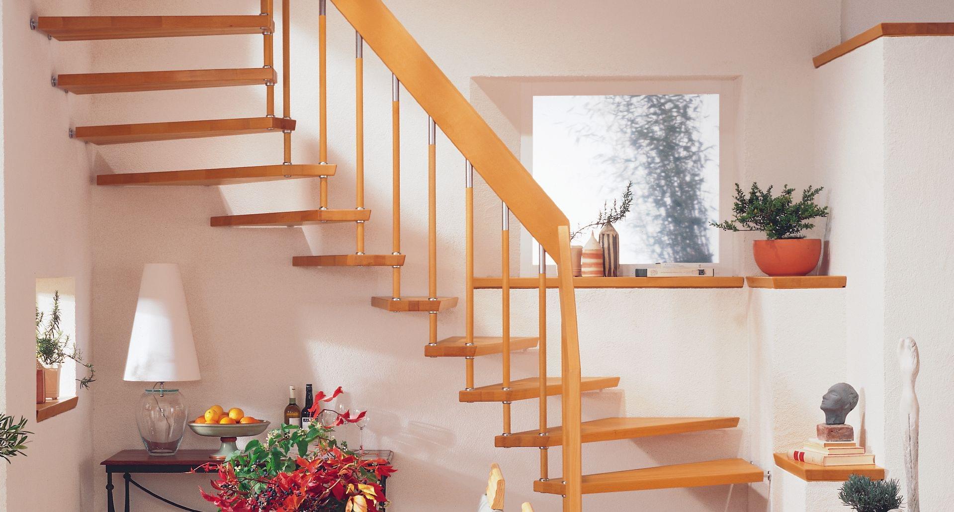 Viva  ist eine Fertigteiltreppe mit Trittstufen und tragendem Handlauf aus Massivholz Buche. Unsichtbar halten gummigelagerte Stahlbolzen auf der Wandseite und der Handlauf auf der Geländerseite die Stufen.