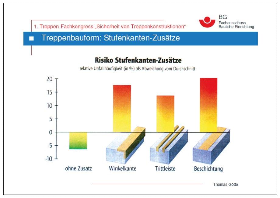 Die meisten Treppenunfälle am unteren Treppenende (Antritt), da dieses oft nicht rechtzeitig erkannt wird. Auch der Treppenanfang (Austritt) birgt Gefahren. Ein weiteres Risiko sind Stufenkanten-Zusätze, deren Radius über 10 mm liegt. Hier besteht Rutschgefahr. Gefährlich können auch Stufenkanten sein, die eigentlich als Sicherheitsprofile eine Treppe besser begehbar machen sollten. Gute Profile schließen Stufen flächenbündig und dauerhaft ab, oder verbessern rutschige Stufenflächen. Wenn sie aber unsachgemäß eingebaut sind und zu weit vorstehen, oder nicht gewartet werden, kann der Schuh bzw. Fuß daran hängen bleiben, der Gehrhythmus wird gestört und man kann stolpern.