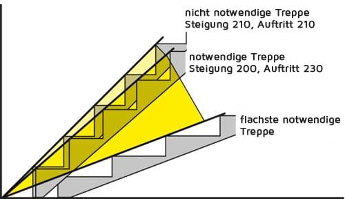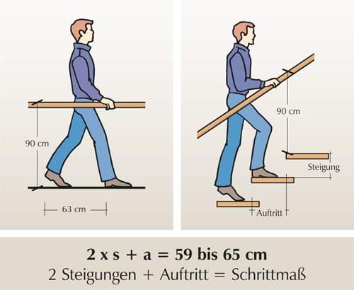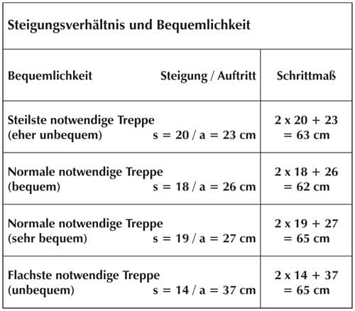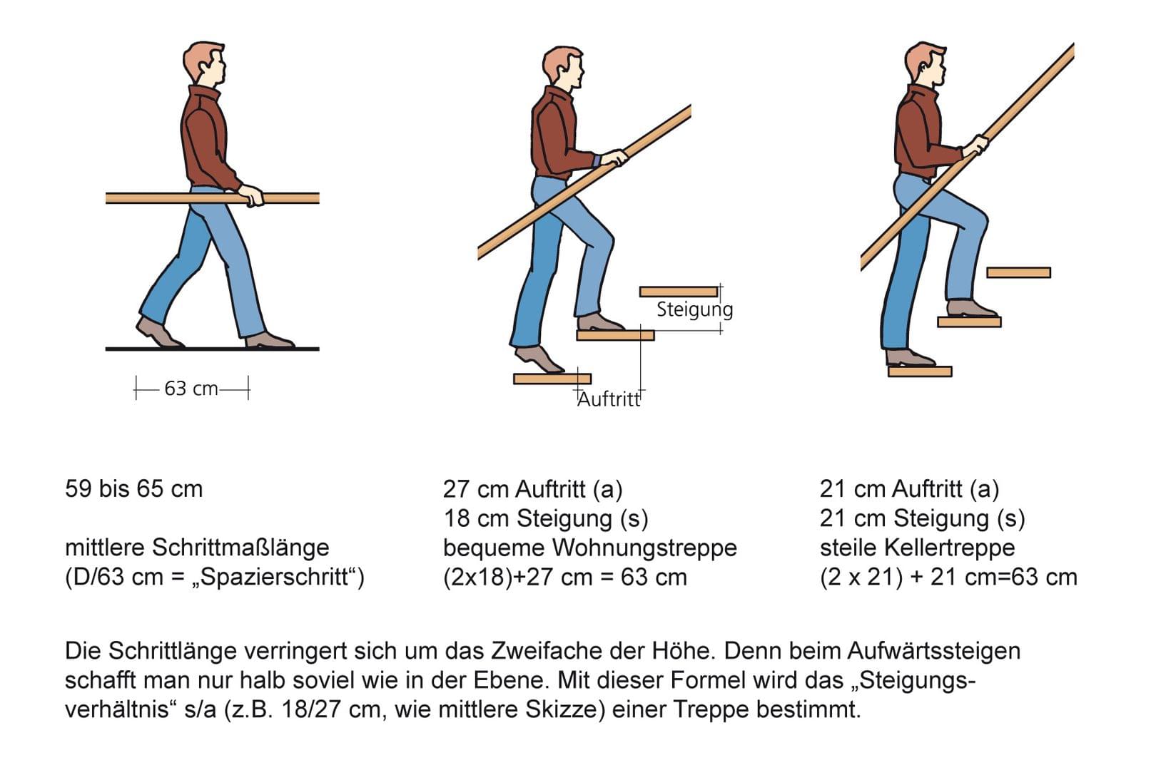 Die Schrittlänge verkürzt sich beim Treppensteigen um das 2-fache der Höhe. Wenn man 10 cm hochsteigt, beträgt die horizontale Schrittlänge nur noch 43 cm (bei 18 cm noch 27 cm).  Dadurch ergibt sich ein empfehlenswertes Steigungsverhältnis 18/27 cm für Treppen.