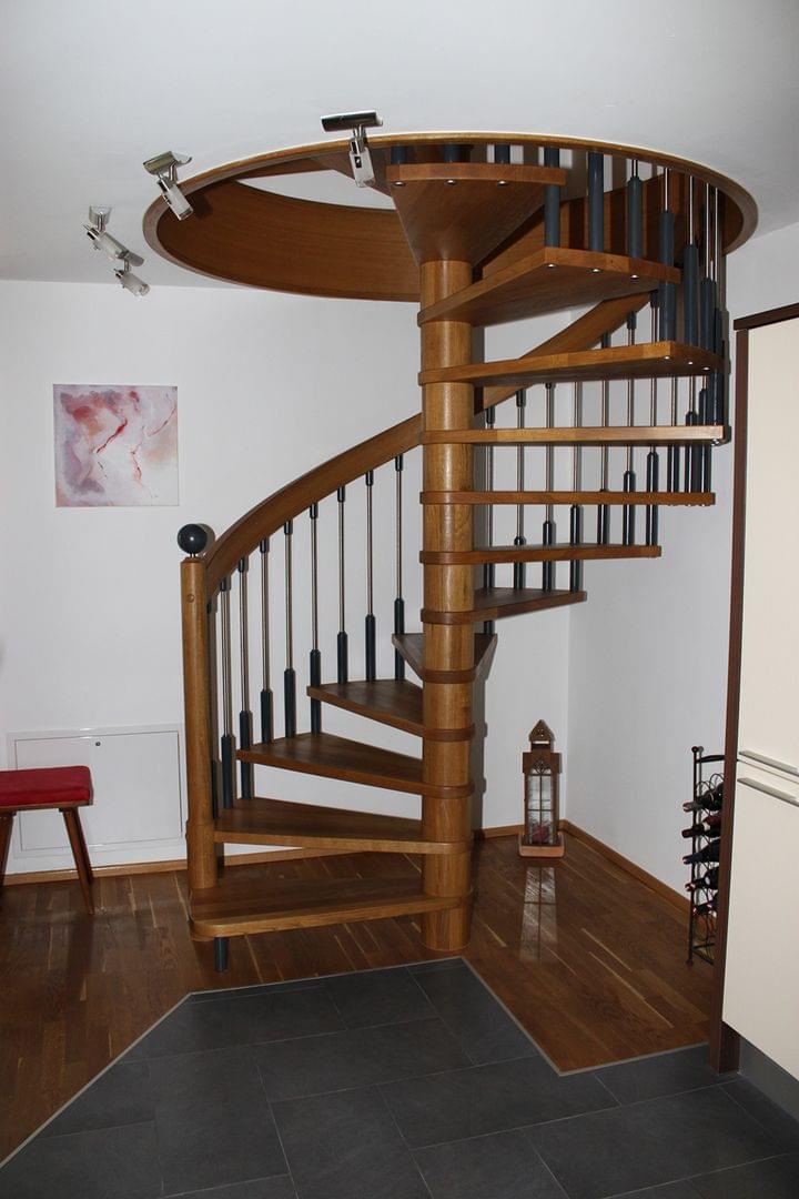 Die Spindelsäule, der geschwungene Handlauf und die aufgefächerten Trittstufen verleiten dieser Konstruktion eine interessante Note.
