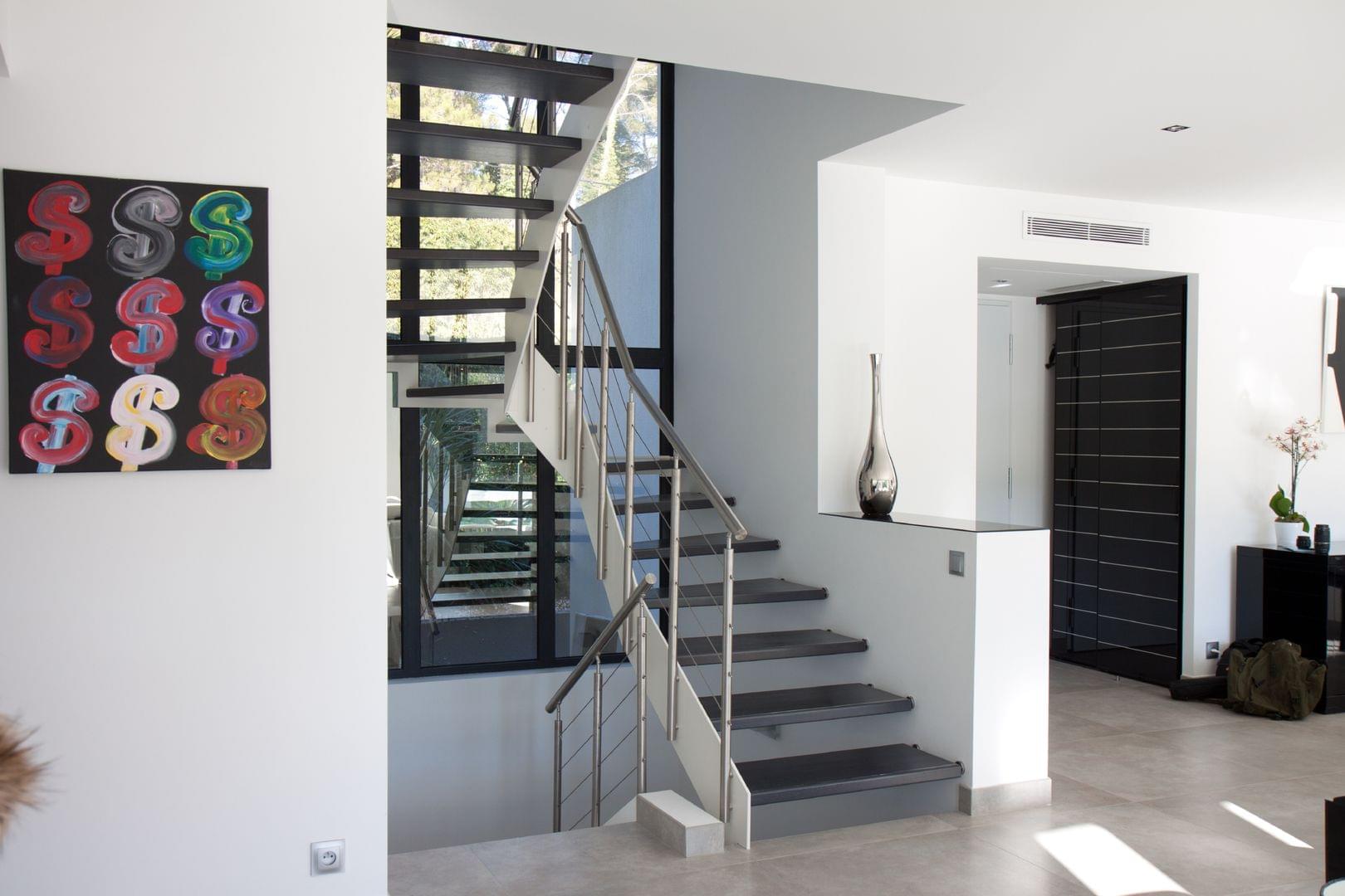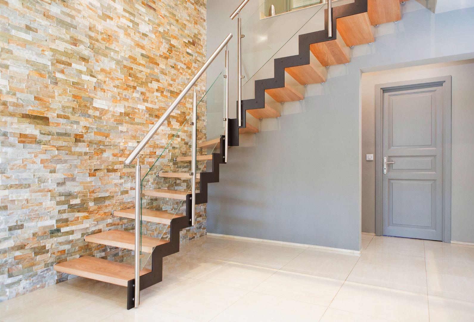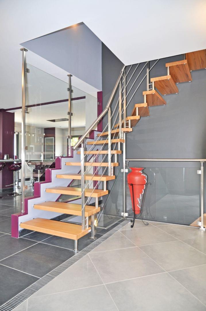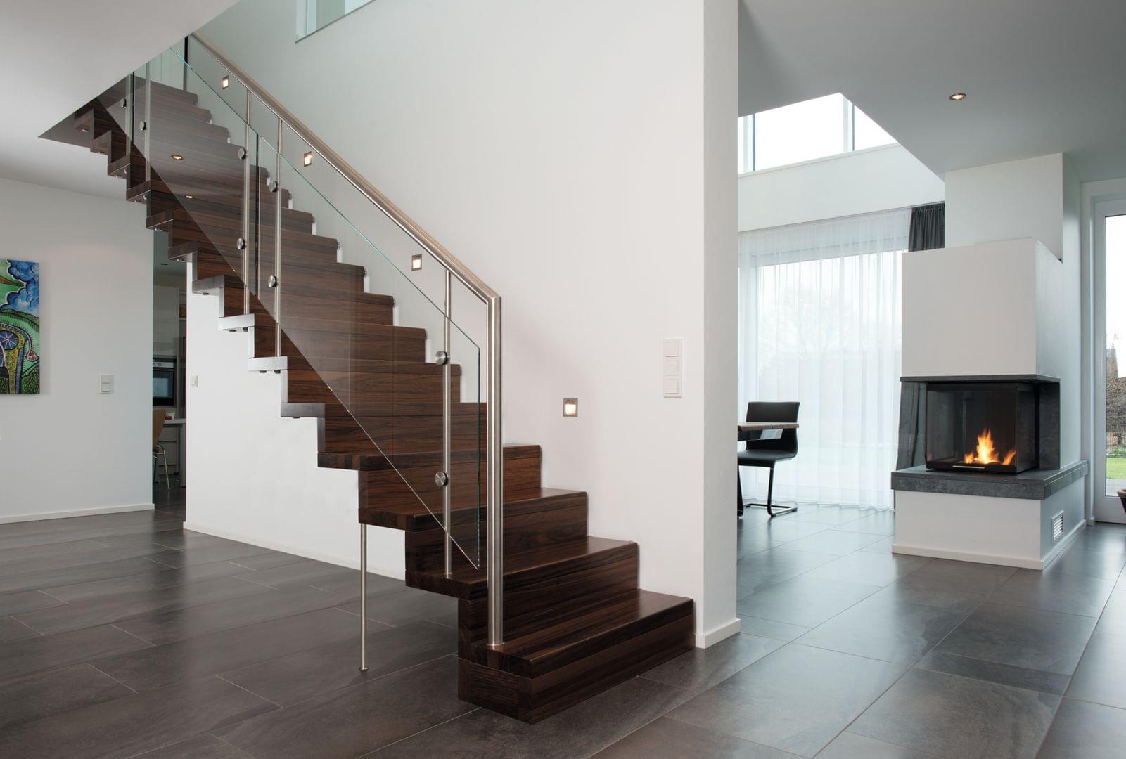 Stahlwangentreppe mit Edelstahlhandlauf und Glastreppengeländer Treppenmeister 5245b