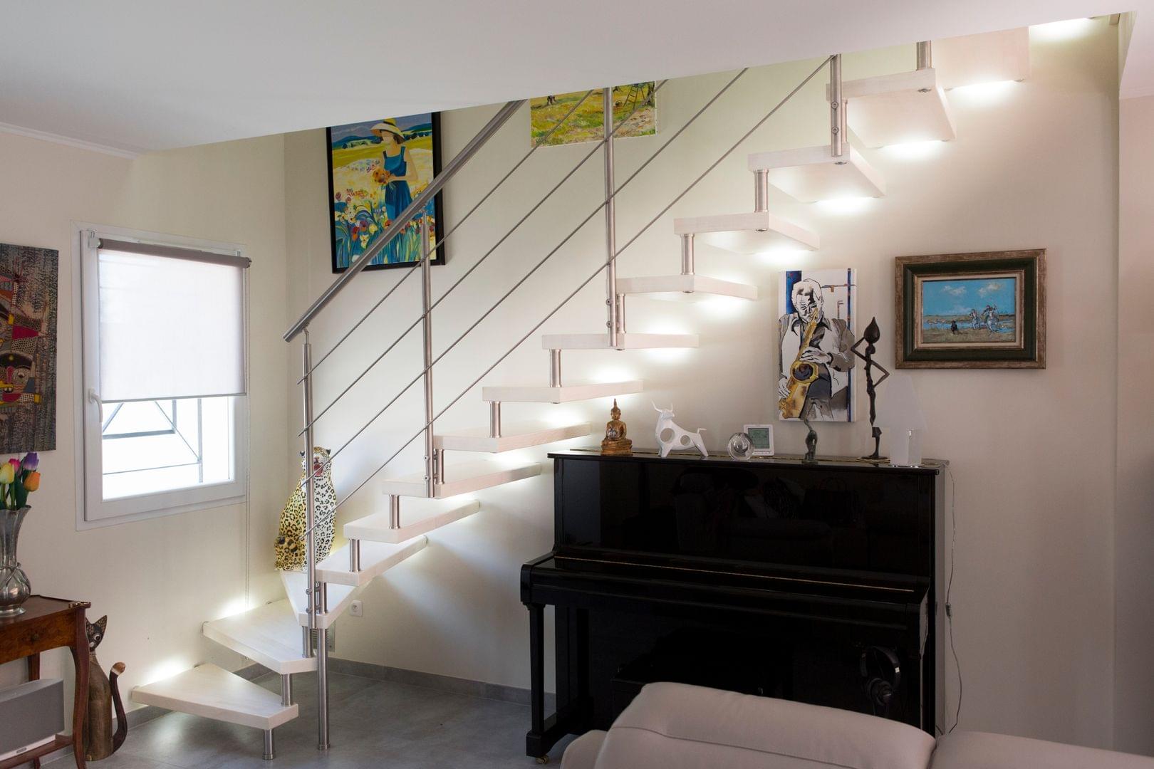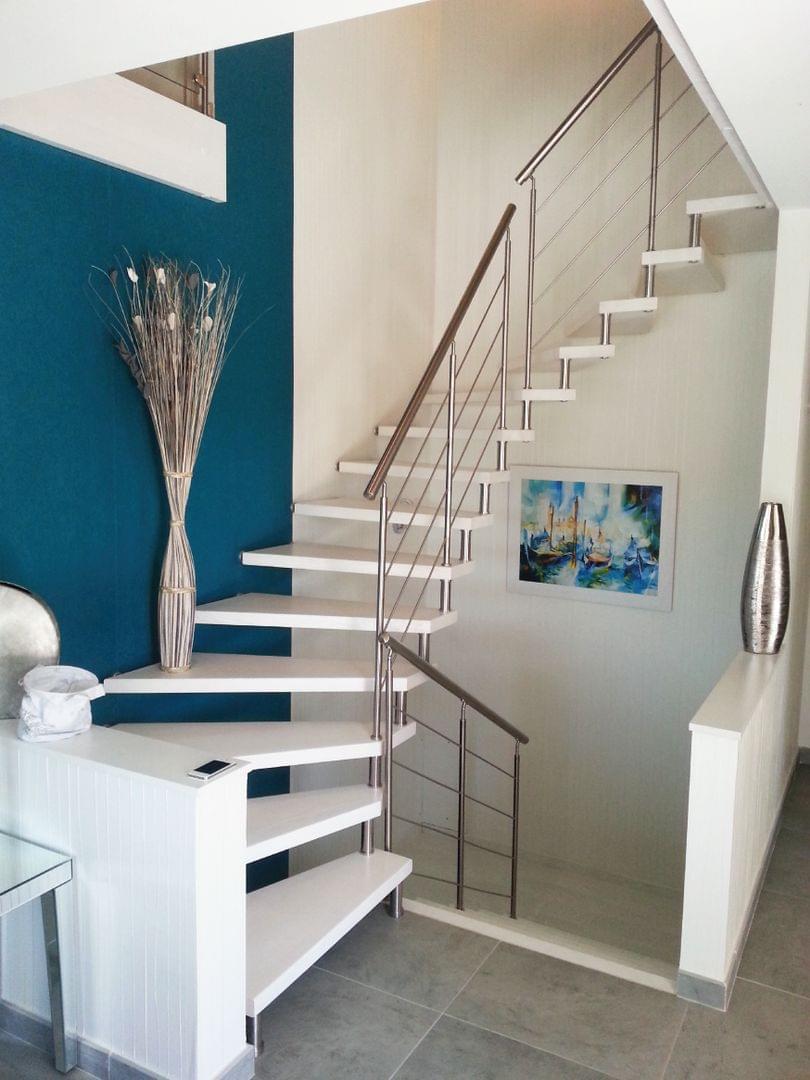 Bolzentreppe halbgewendelt weiß lackierte Stufen - Edelstahlgeländer Treppenmeister 5244e