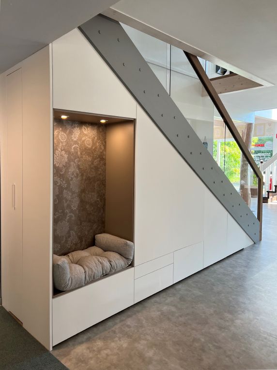Oft braucht es gar keine zusätzlichen Räume. In vielen Fällen lautet die Lösung: mehr Stauraum schaffen. Die Treppenmeister vor Ort unterstützen Sie auch mit maßgeschneiderten Einbauschränken. Diese können wir beispielsweise als Treppenschrank, Schuhschrank, Kleiderschrank oder sogar als Sitznische umfunktionieren. Etwas Platz unter der Treppe bedeutet zahlreiche Ideen.