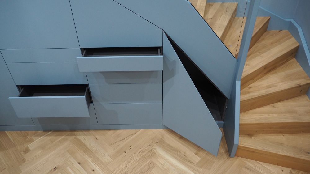Nutzen Sie die Chance, Ihren Wohnbereich zu vergrößern und zugleich für mehr Ordnung zu sorgen. Die vielseitigen Aufbewahrungsmöglichkeiten sowie der Stauraum unter der Treppe passen sich Ihren individuellen Anforderungen an. Lassen Sie sich von den Treppenmeister-Experten mit fachkundiger Beratung beraten für Stauraum mit System und in meisterhafter Ausführung!