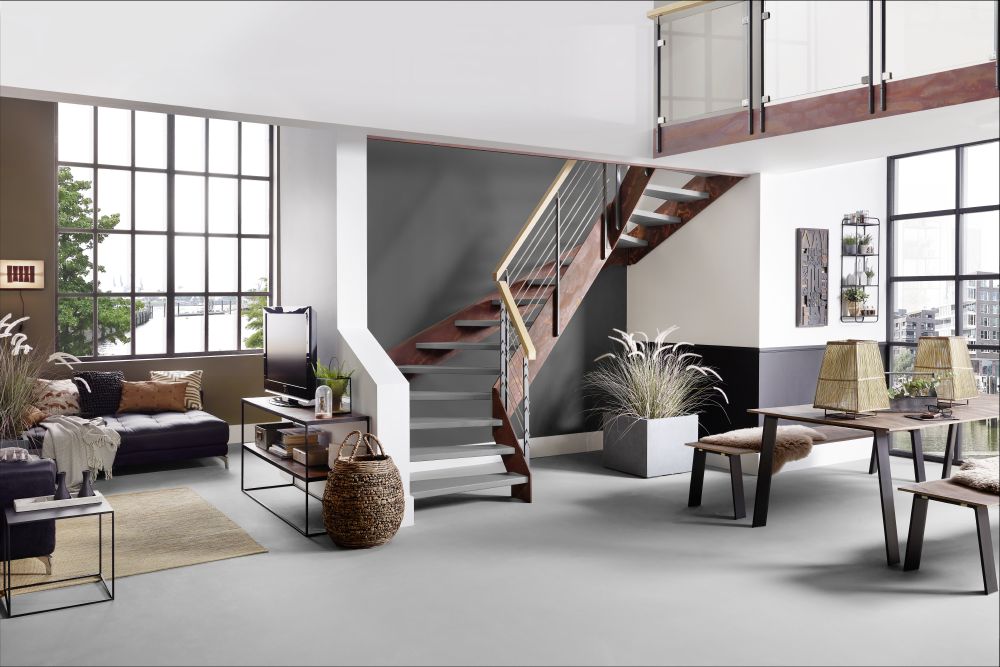 Hinter der Wangentreppe Loft verbirgt sich eine clevere, optische Täuschung. Hier sind nämlich nur die tragenden Teile wirklich aus Stahl oder Metall. Die Wangen sind zwar in Rostoptik gehalten, bestehen aber aus einem Verbundwerkstoff. Die Holzstufen scheinen, als ob sie aus Beton gegossen sind. So bekommen Sie das Beste aus zwei Welten: ein besonderes Design und die besten Materialien.