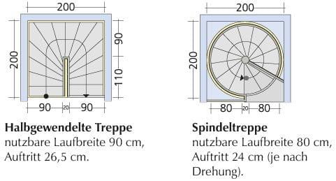 Im Internet heißt es immer wieder, dass Wendeltreppen besonders platzsparend seien. Das ist aber nicht wirklich der Fall. Wenn jeder Zentimeter Auftritt entscheidend ist, sollten Sie eine halbgewendelte Treppe und keine Spindeltreppe wählen. Diese Treppen sind besser begehbar und schenken Ihrem Wohnraum mehr Fläche durch den Treppengrundriss. Sehen Sie selbst den Unterschied im Grundriss einer gewendelten Treppe und einer Spindeltreppe: