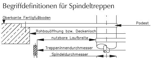 Hier sehen Sie eine technische Zeichnung mit beschrifteten Maßen und Begriffen (z. B. Podest, Spindeldurchmesser, Treppeninnendurchmesser), also genau eine Begriffs- bzw. Maßdefinition für Spindeltreppen.